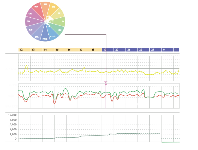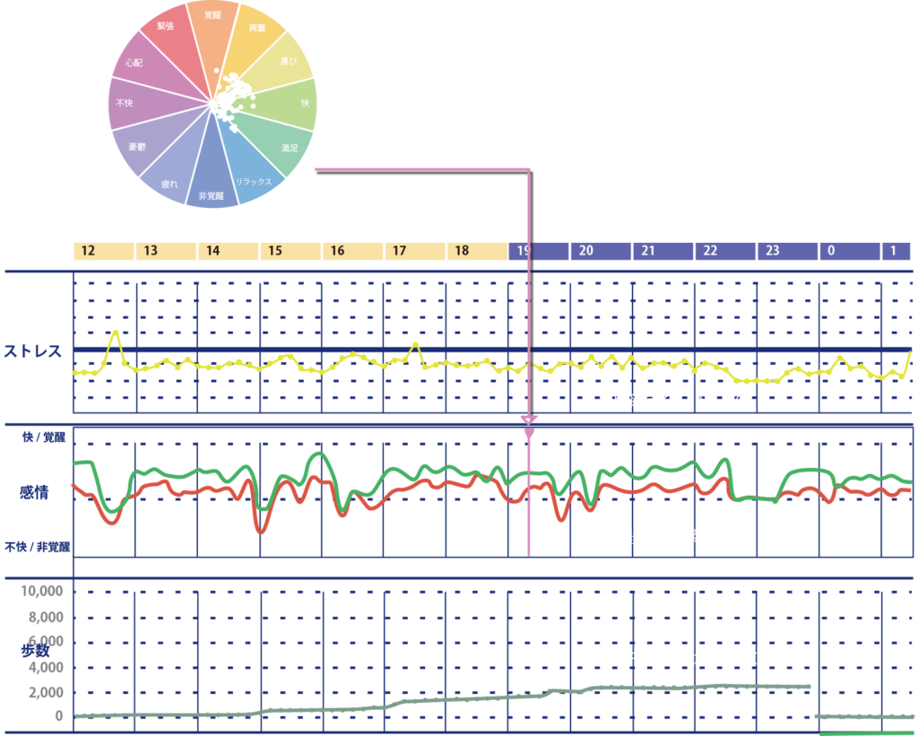 ストレス・感情および歩数も時間軸に沿って詳細解析