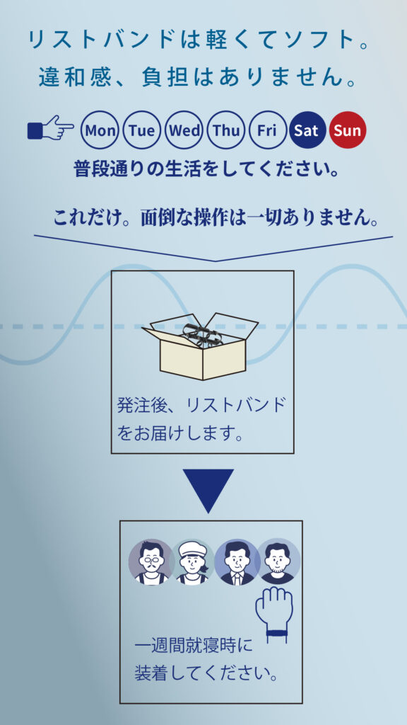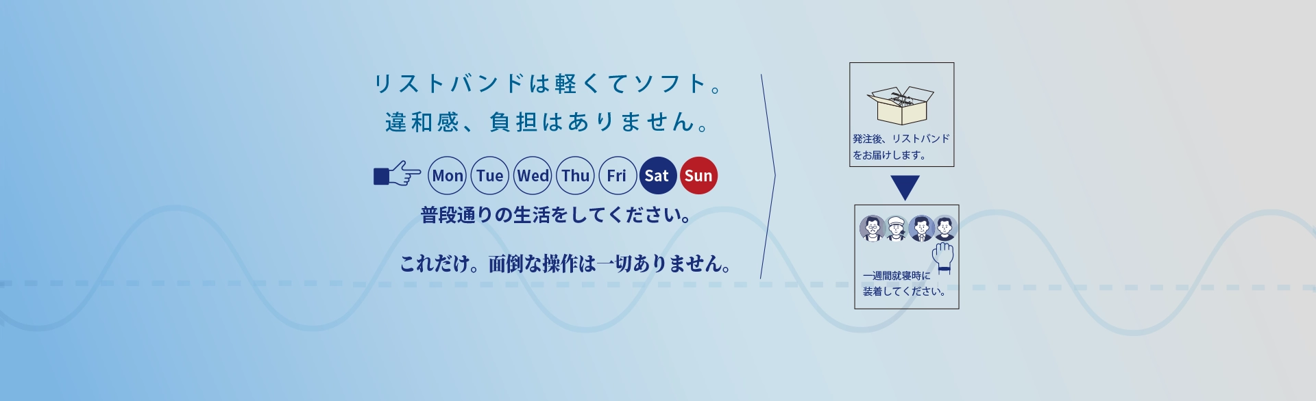 また本サービスで用いるウェアラブルデバイスは、汎用のリストバントであり、医療行為(疾病の診断。治療、予防)に用いることを目的にしているものではありません。