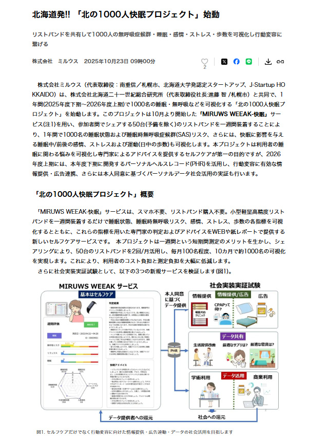 ミルウスは㈱北海道二十一世紀総合研究所と共同で「北の1000人快眠プロジェクト実行委員会」を設立。